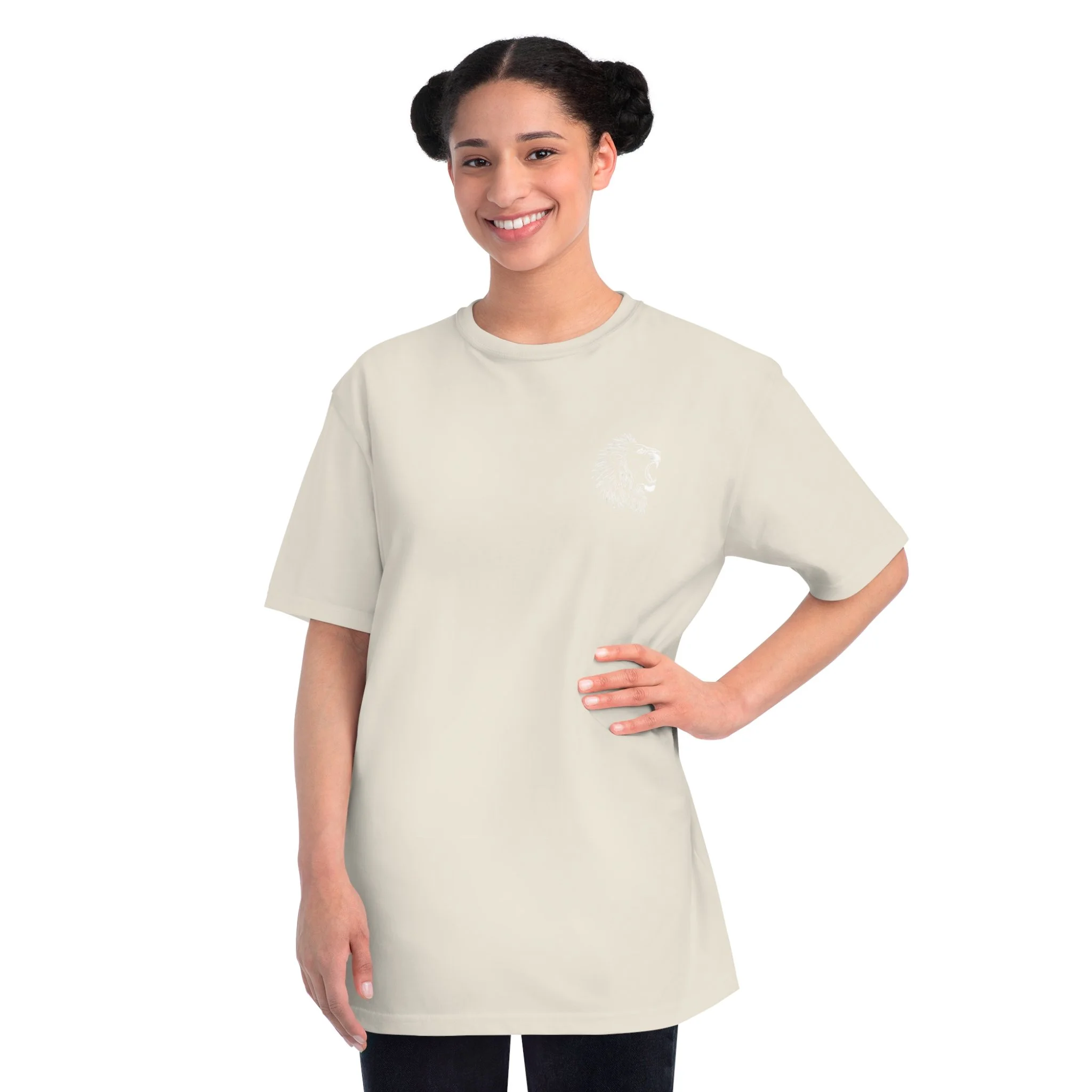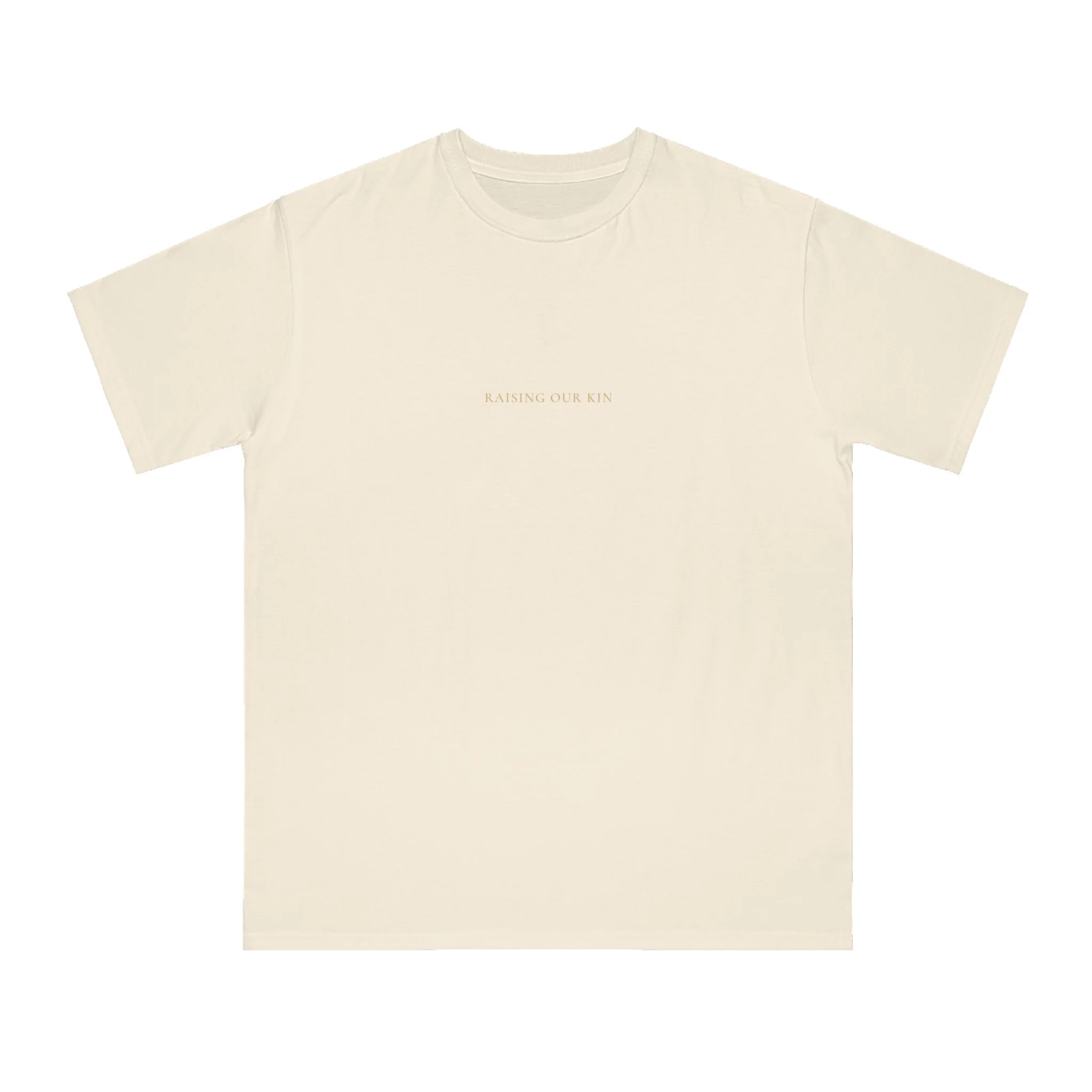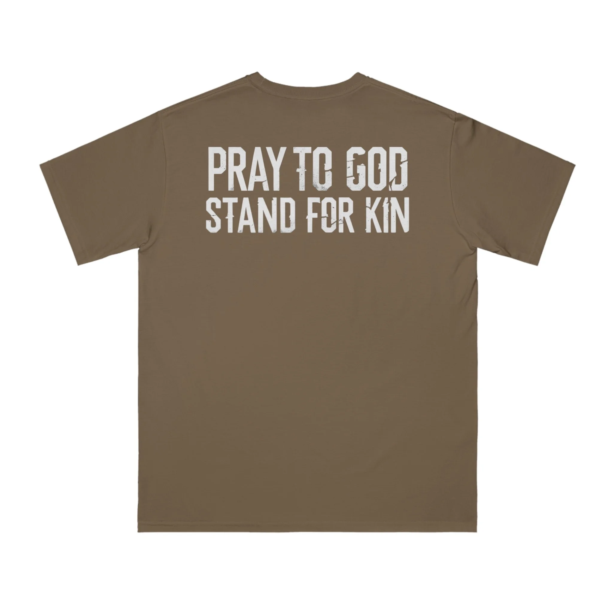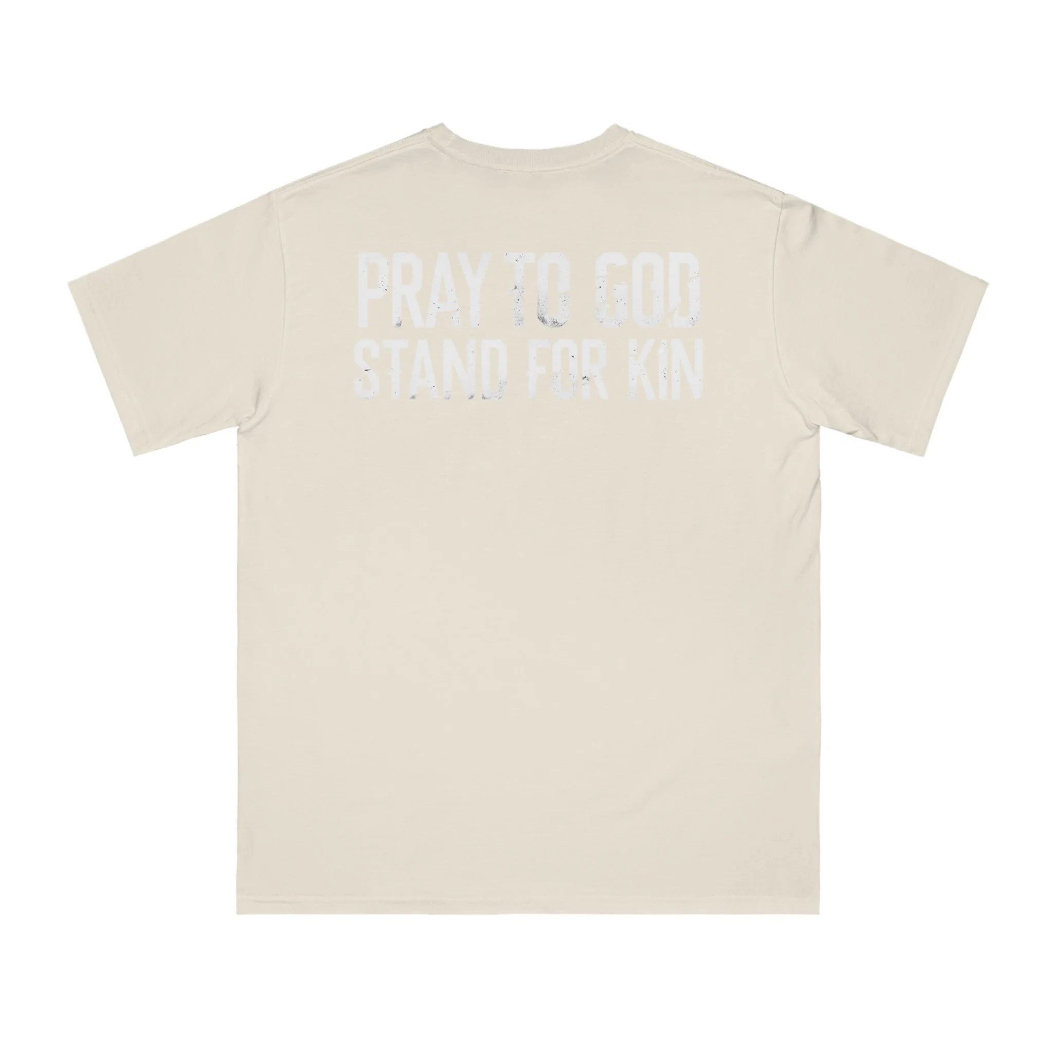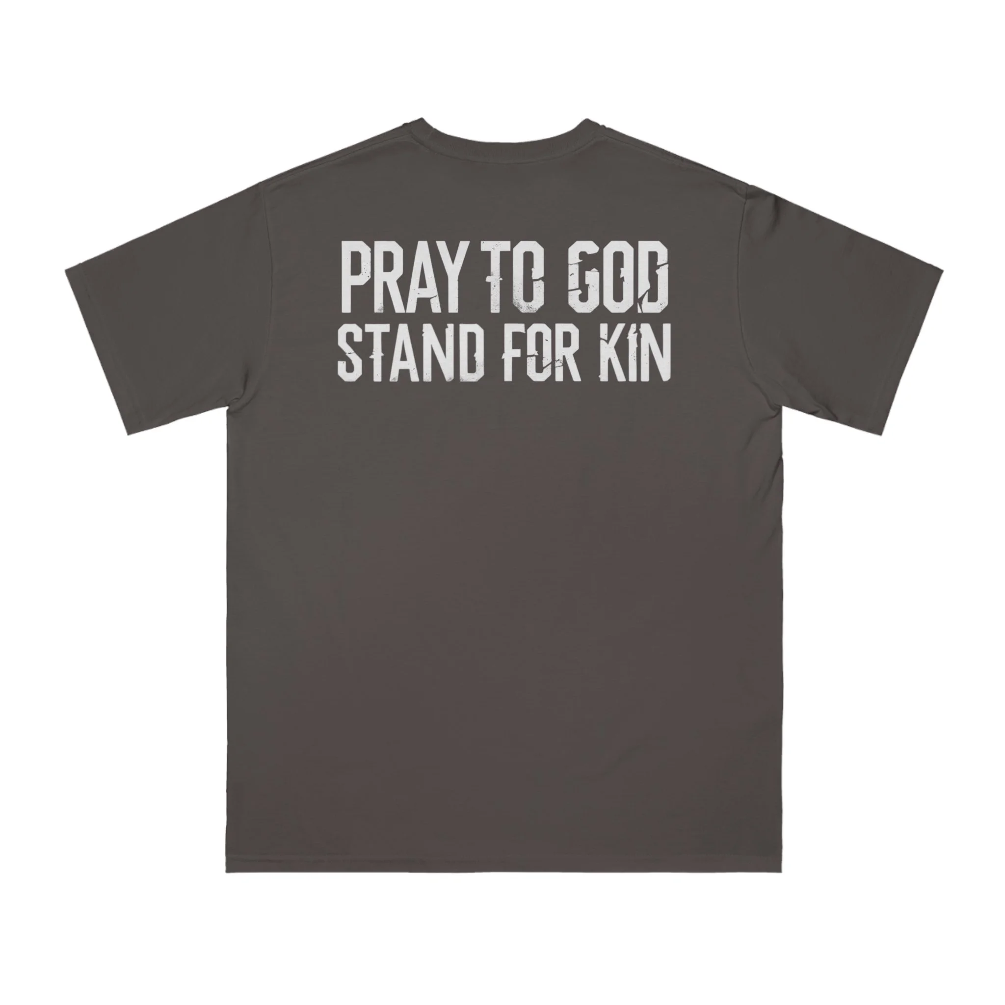 This organic unisex classic T-shirt features the inspiring message 'Pray To God Stand For Kin'. It gives off a positive and empowering vibe, making it a great addition to anyone's wardrobe. Perfect for those who value faith and family, this T-shirt is ideal for everyday wear, religious gatherings, family reunions, and casual outings.